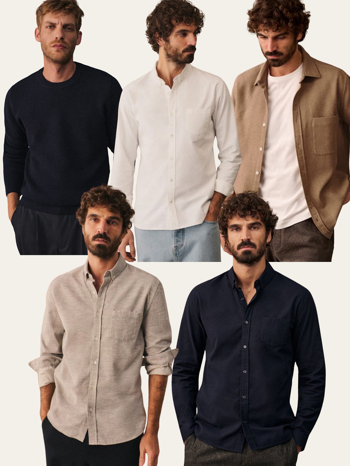 From Left to Right (Clockwise): Chuck Sweater / Oxford Charlie White Shirt / Lars Beige Shirt / Velvet Charlie Grey Shirt / Flannel Charlie Navy Shirt